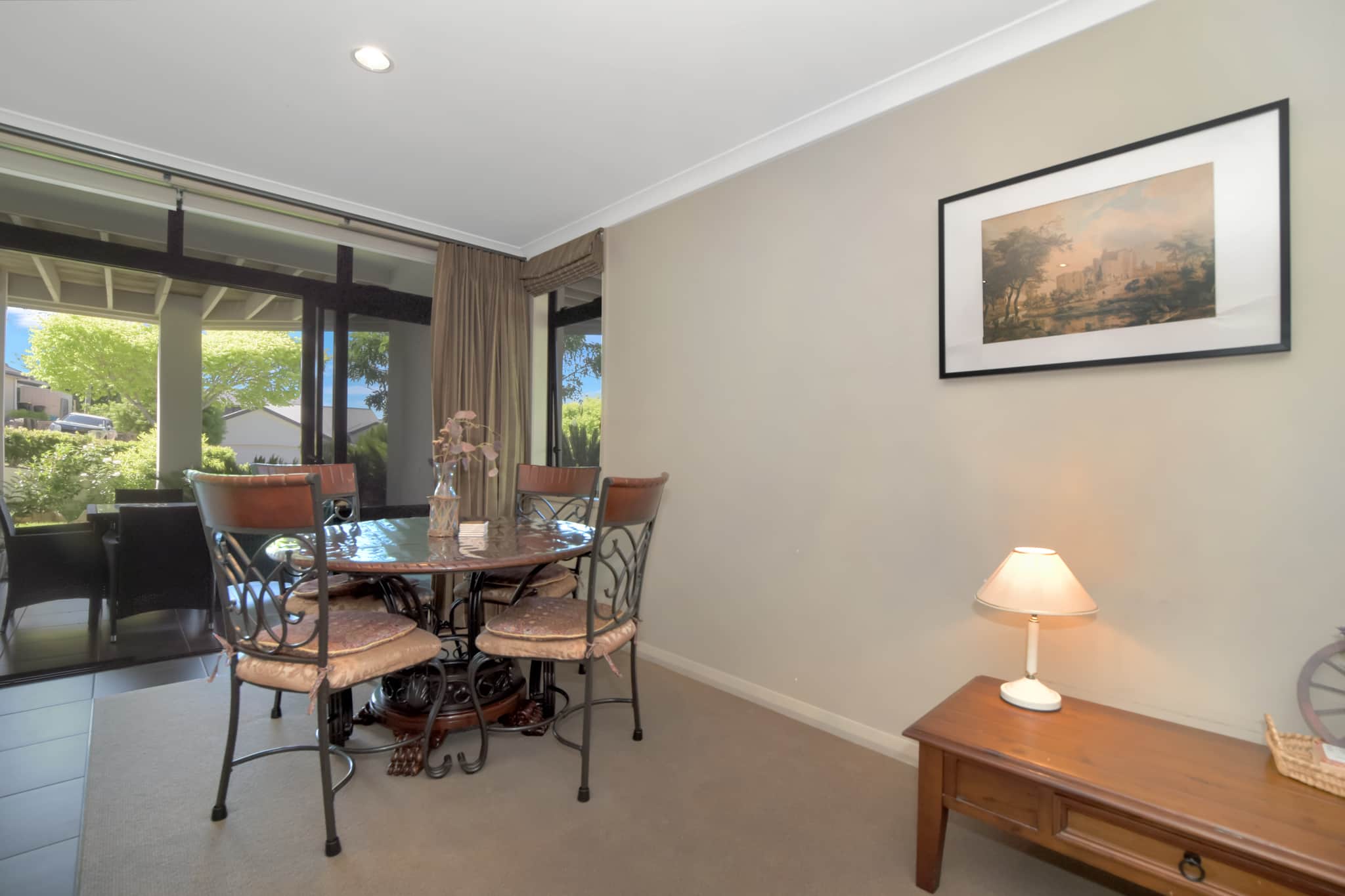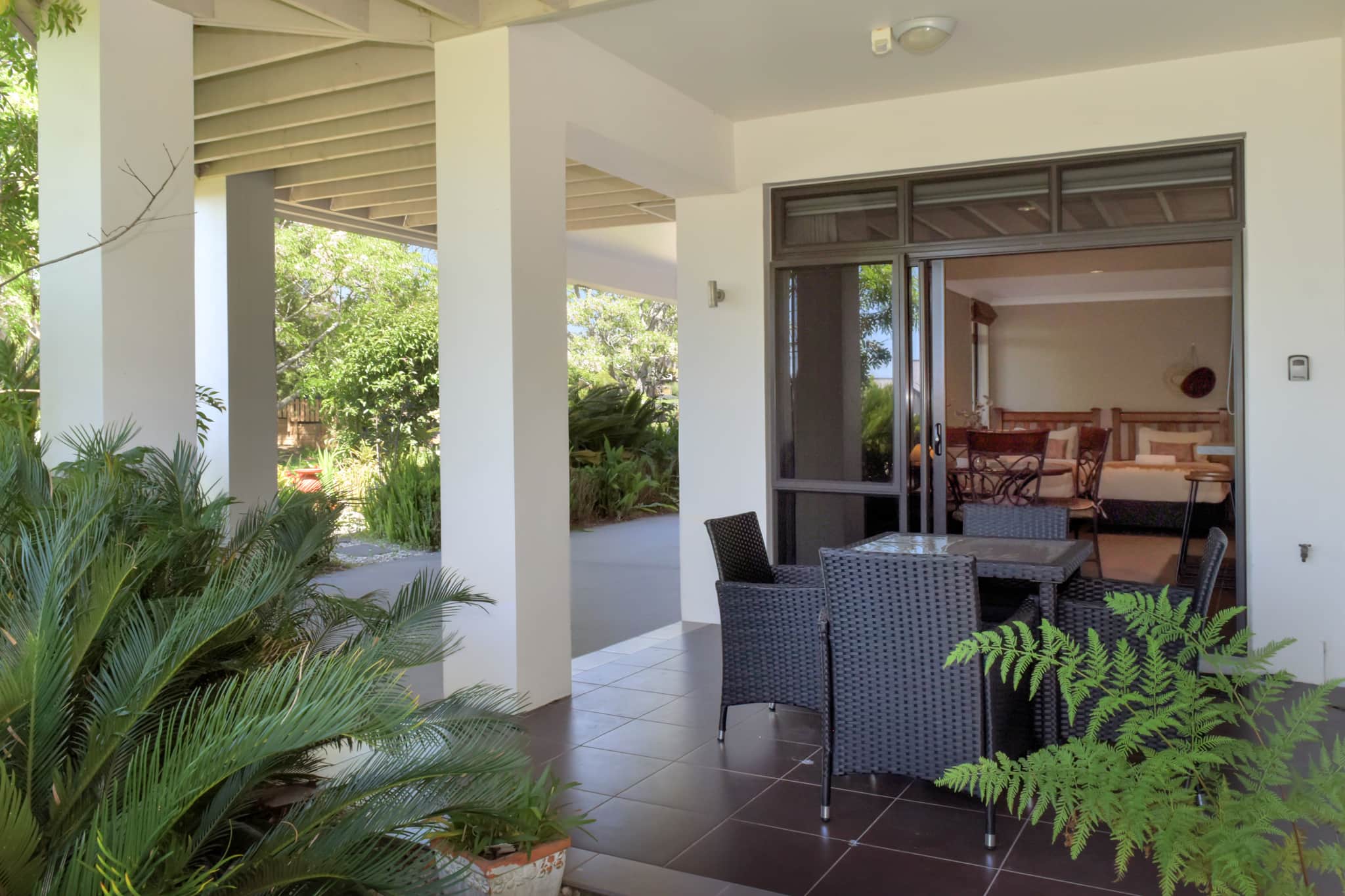 ● The living area opens onto a covered outdoor space overlooking the garden—perfect for relaxing after a day out.